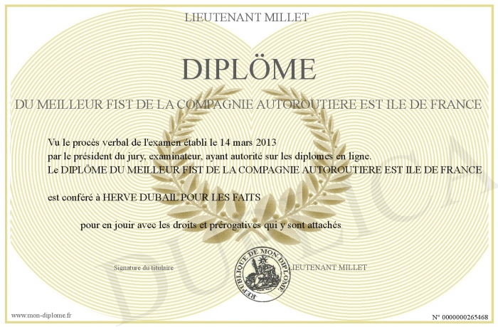 Envoyez par email votre DIPLÖME DU MEILLEUR FIST DE LA COMPAGNIE AUTOROUTIERE EST ILE DE FRANCE personalisé