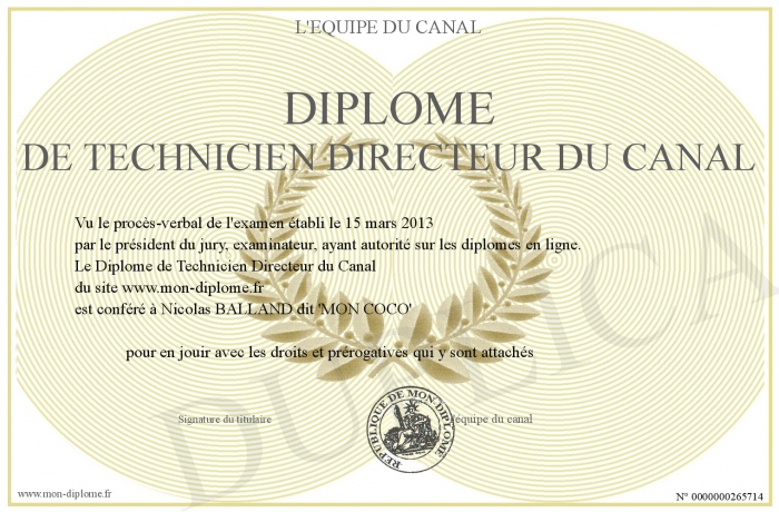 Envoyez par email votre Diplôme de Technicien Directeur du Canal personalisé