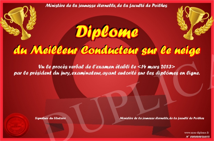 Envoyez par email votre Diplôme du Meilleur Conducteur sur le neige personalisé