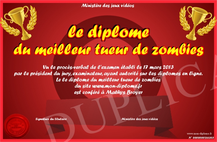 Envoyez par email votre le diplome du meilleur tueur de zombies personalisé