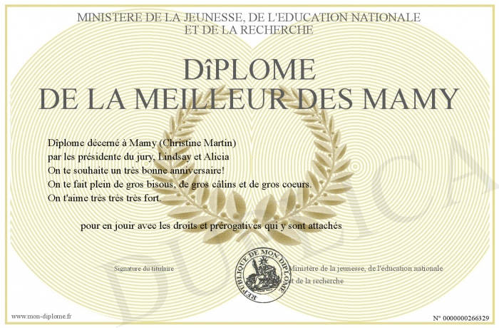 Envoyez par email votre Dîplome de la Meilleur des Mamy personalisé