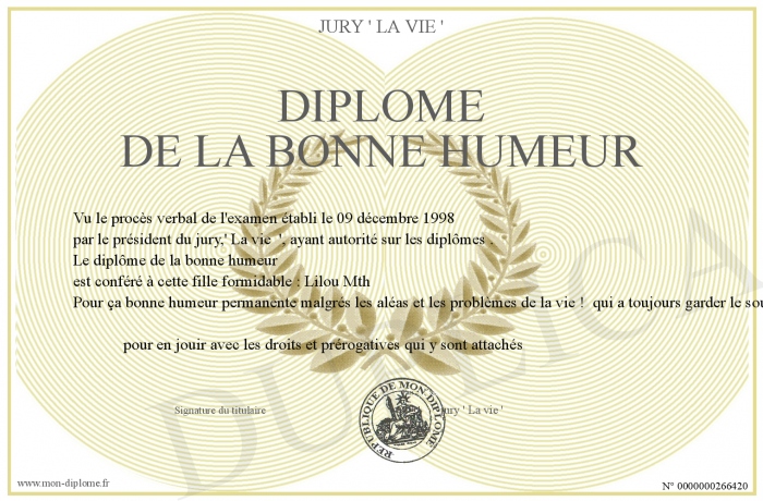 Envoyez par email votre Diplôme de la bonne humeur personalisé