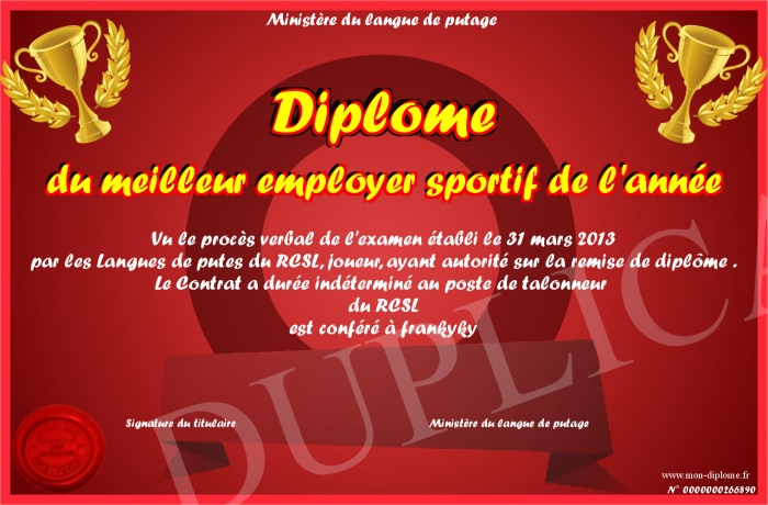 Envoyez par email votre Diplôme du meilleur employer sportif de l'année personalisé