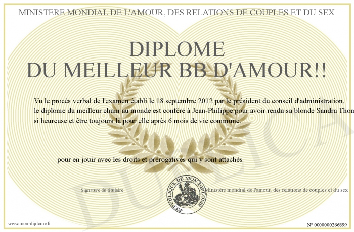 Envoyez par email votre Diplôme du meilleur BB D'AMOUR!! personalisé