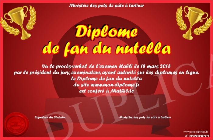 Envoyez par email votre Diplôme de fan du nutella personalisé