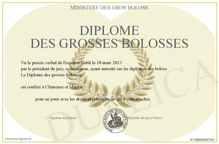 Envoyez par email votre Diplôme des grosses bolosses personalisé