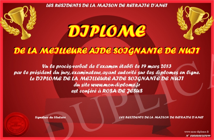 Envoyez par email votre DIPLOME DE LA MEILLEURE AIDE SOIGNANTE DE NUIT personalisé