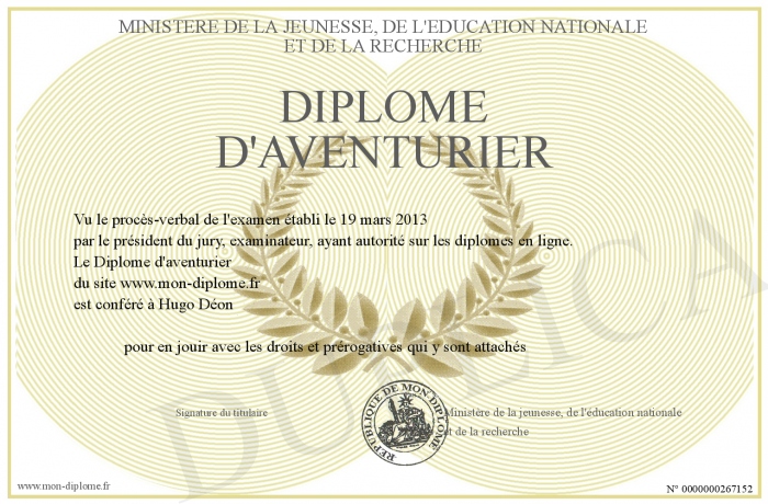 Envoyez par email votre Diplôme d'aventurier personalisé