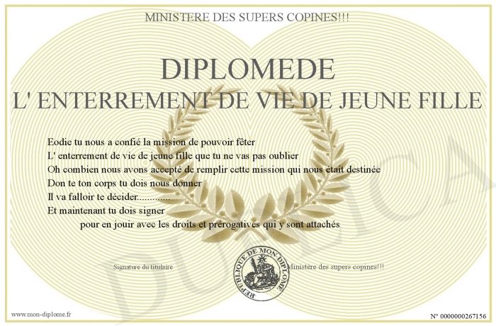 Envoyez par email votre Diplômede l' enterrement de vie de jeune fille personalisé