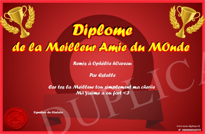 Envoyez par email votre Diplome de la Meilleur Amie du MOnde personalisé