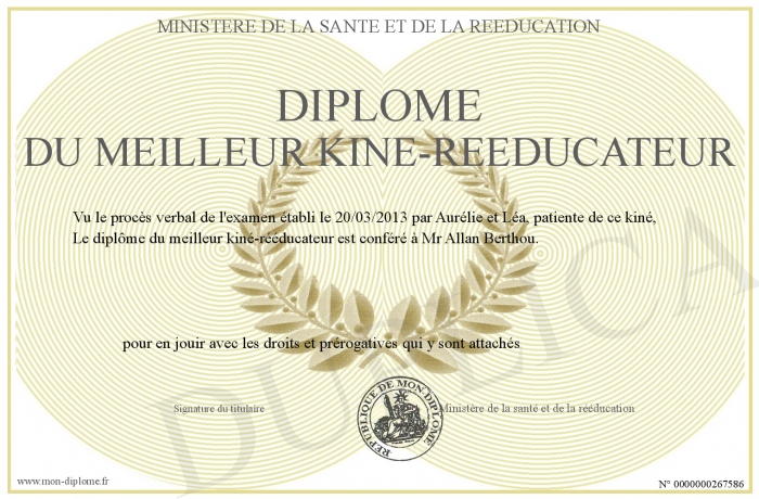 Envoyez par email votre Diplôme du meilleur kiné-rééducateur personalisé