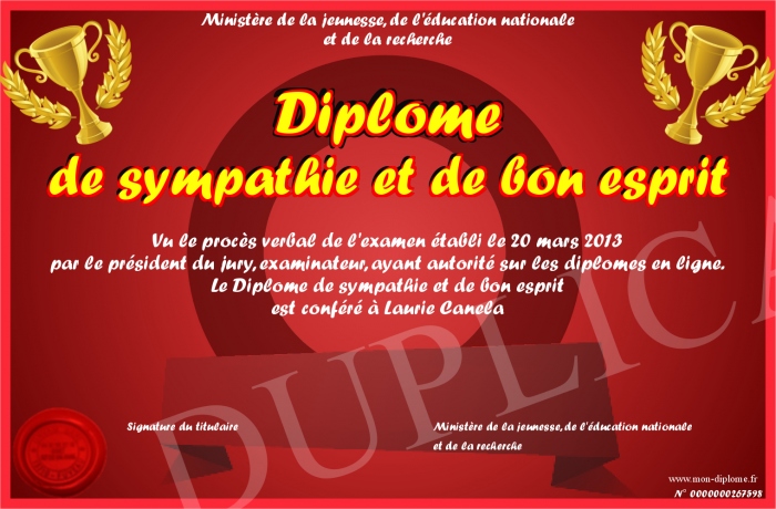 Envoyez par email votre Diplome de sympathie et de bon esprit personalisé