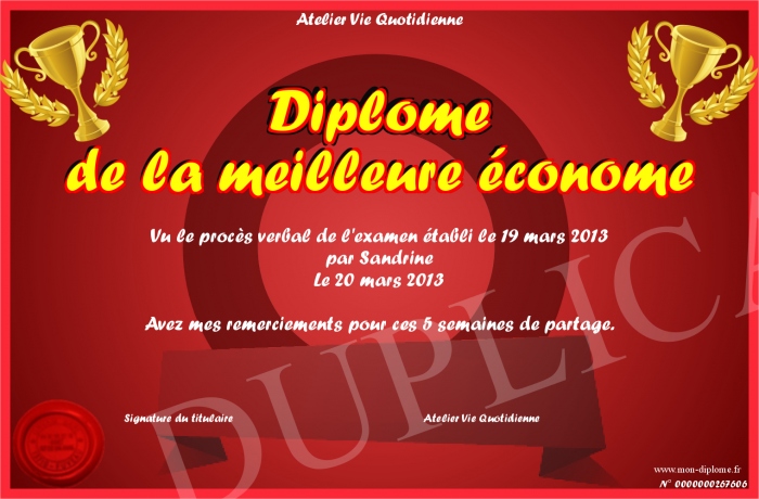 Envoyez par email votre Diplôme de la meilleure économe personalisé