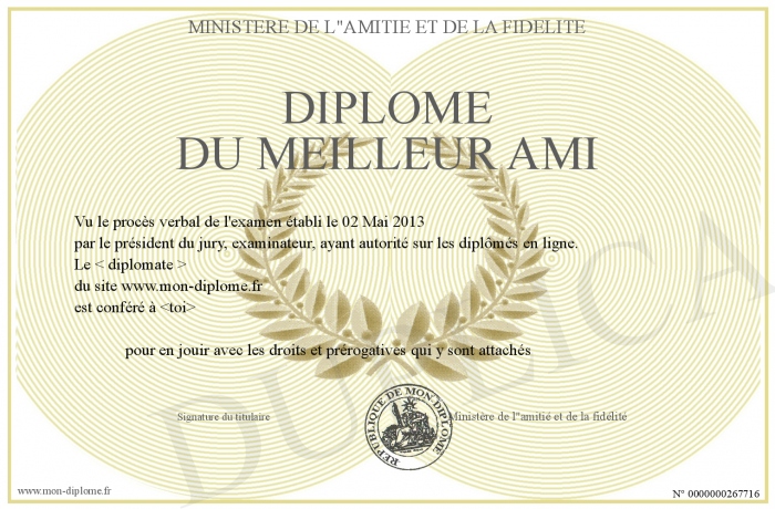 Envoyez par email votre Diplôme du MEILLEUR AMI personalisé