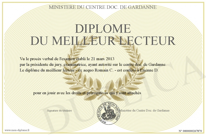 Envoyez par email votre Diplôme du Meilleur Lecteur personalisé