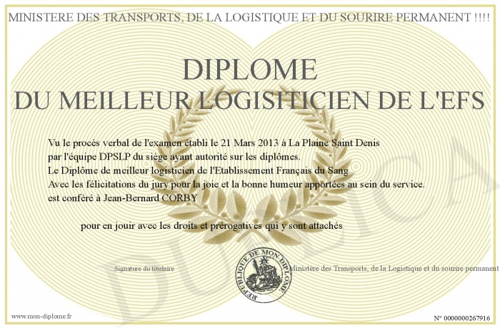 Envoyez par email votre Diplôme du Meilleur Logisiticien de l'EFS personalisé