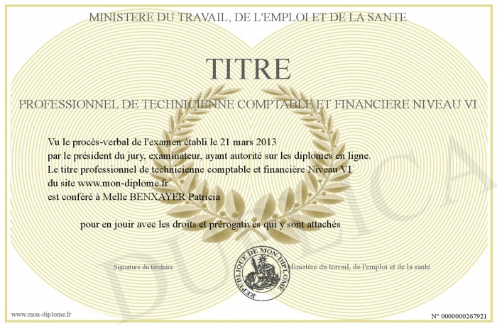 Envoyez par email votre titre professionnel de technicienne comptable et financière Niveau VI personalisé