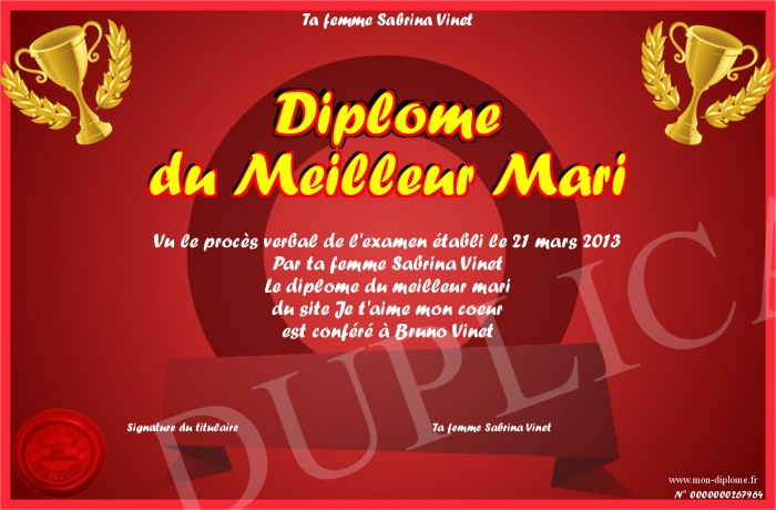 Envoyez par email votre Diplôme du Meilleur Mari personalisé