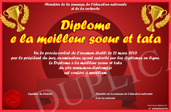 Envoyez par email votre Diplôme e la meilleur soeur et tata personalisé