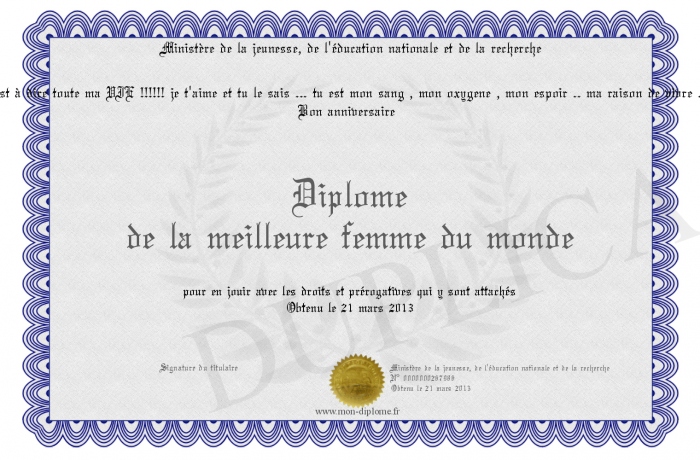 Envoyez par email votre Diplôme de la meilleure femme du monde personalisé
