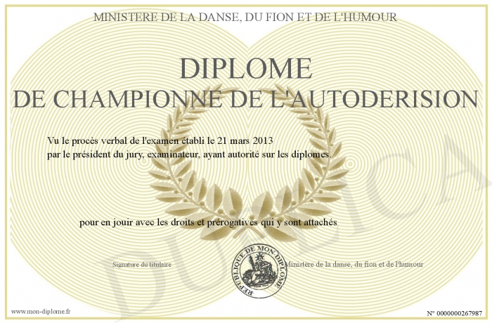 Envoyez par email votre Diplôme de Championne de l'Autodérision personalisé