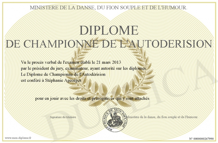 Envoyez par email votre Diplôme de Championne de l'Autodérision personalisé