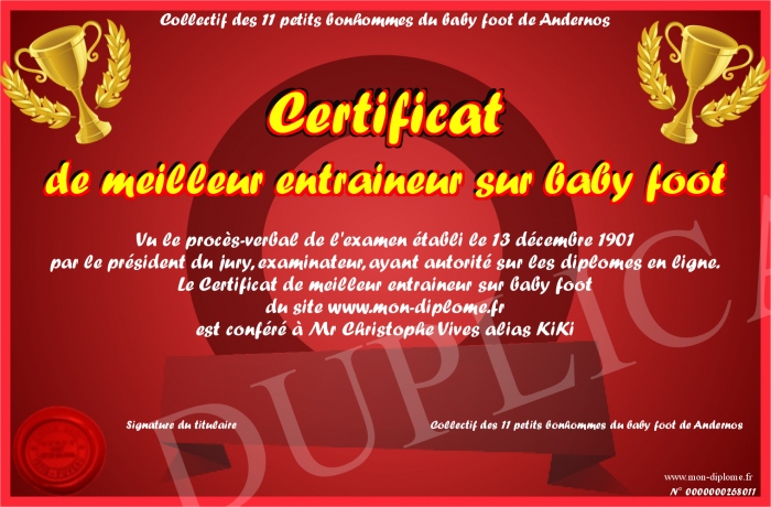 Envoyez par email votre Certificat de meilleur entraineur sur baby foot personalisé