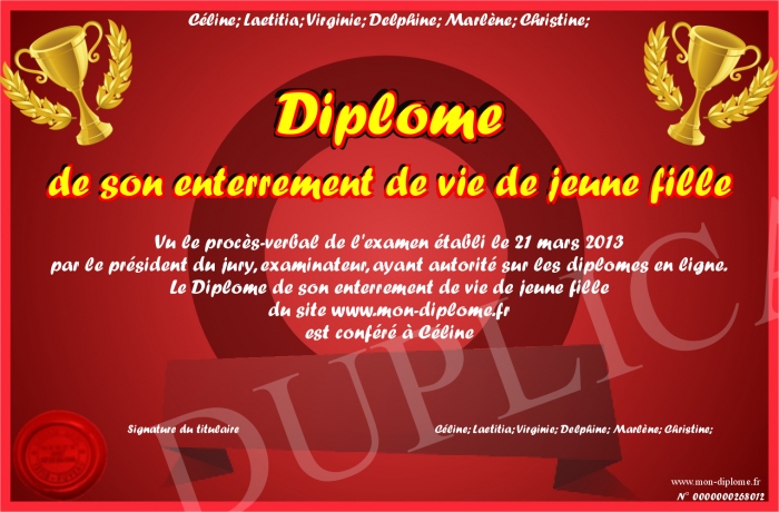 Envoyez par email votre Diplôme de son enterrement de vie de jeune fille personalisé
