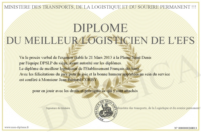 Envoyez par email votre Diplôme du Meilleur logisticien de l'EFS personalisé