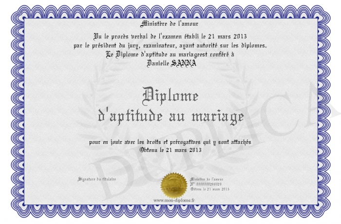Envoyez par email votre Diplome d'aptitude au mariage personalisé