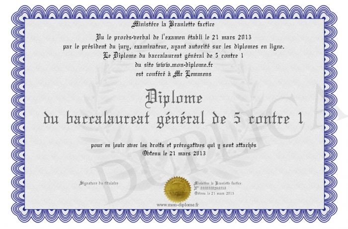 Envoyez par email votre Diplôme du baccalaureat général de 5 contre 1 personalisé