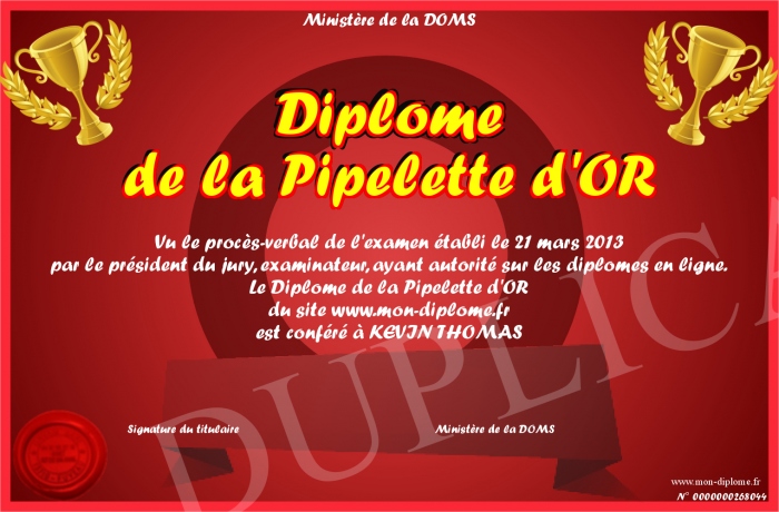 Envoyez par email votre Diplôme de la Pipelette d'OR personalisé