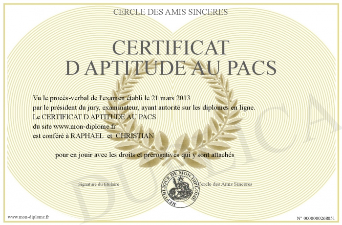 Envoyez par email votre CERTIFICAT D APTITUDE AU PACS personalisé