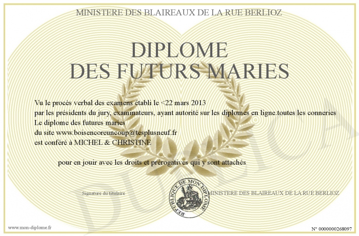 Envoyez par email votre DIPLOME DES FUTURS MARIES personalisé