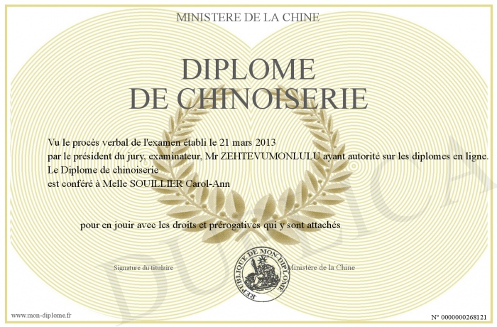 Envoyez par email votre Diplôme de chinoiserie personalisé