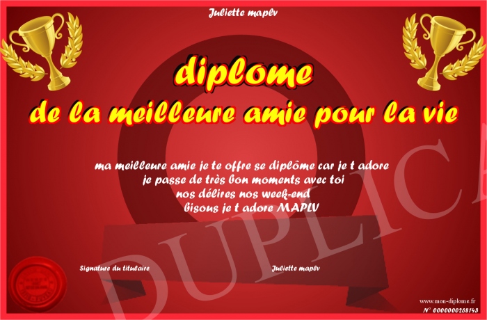 Envoyez par email votre diplome de la meilleure amie pour la vie personalisé