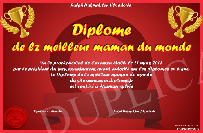 Envoyez par email votre Diplôme de lz meilleur maman du monde personalisé