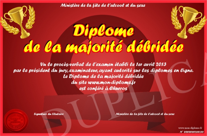 Envoyez par email votre Diplôme de la majorité débridée personalisé