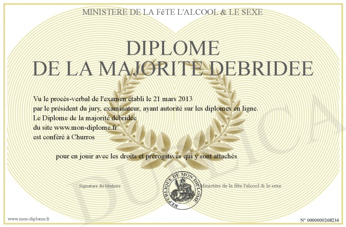 Envoyez par email votre Diplôme de la majorité débridée personalisé