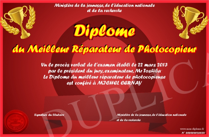 Envoyez par email votre Diplôme du Meilleur Réparateur de Photocopieur personalisé