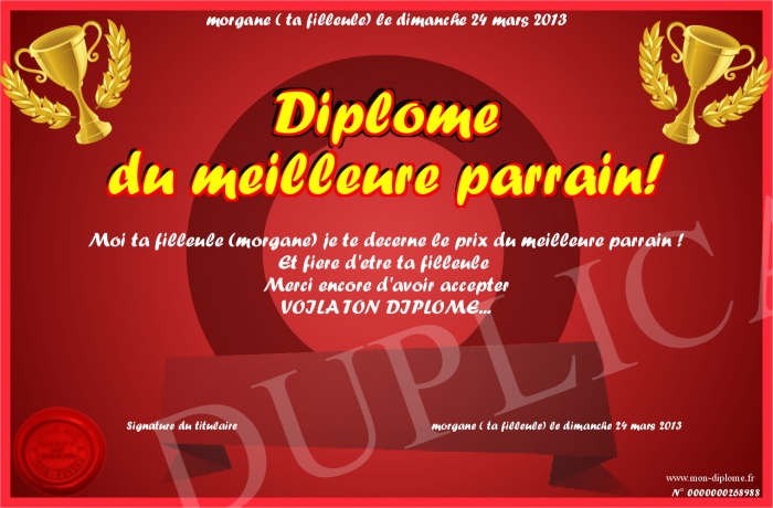 Envoyez par email votre Diplôme du meilleure parrain! personalisé