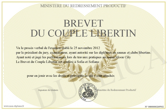 Envoyez par email votre Brevet du Couple Libertin personalisé