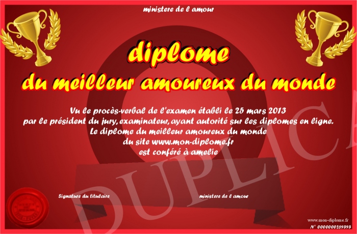 Envoyez par email votre diplome du meilleur amoureux du monde personalisé