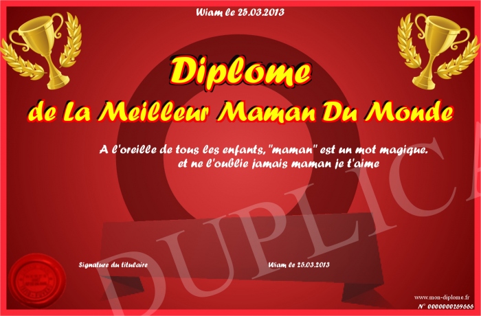 Envoyez par email votre Diplôme de La Meilleur Maman Du Monde personalisé