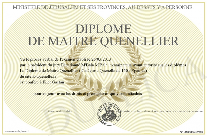 Envoyez par email votre Diplôme de Maitre Quenellier personalisé