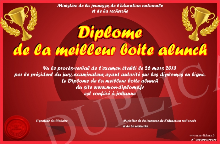 Envoyez par email votre Diplôme de la meilleur boite alunch personalisé
