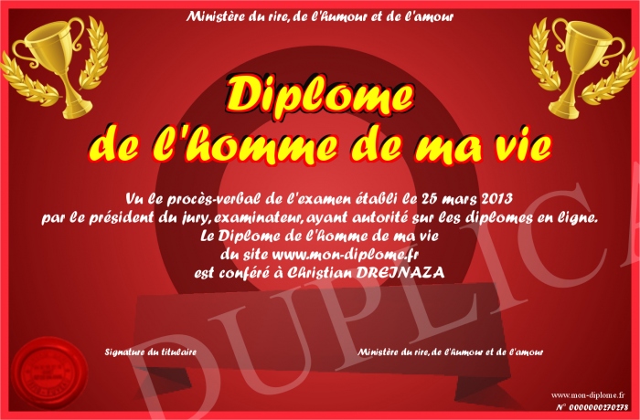Envoyez par email votre Diplome de l'homme de ma vie personalisé
