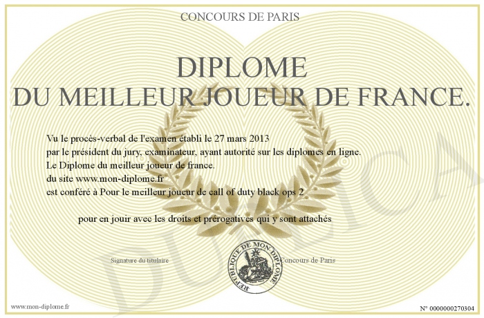 Envoyez par email votre Diplôme du meilleur joueur de france. personalisé