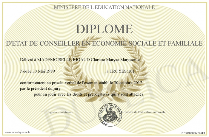 Envoyez par email votre Diplôme d'etat de conseiller en economie sociale et familiale personalisé