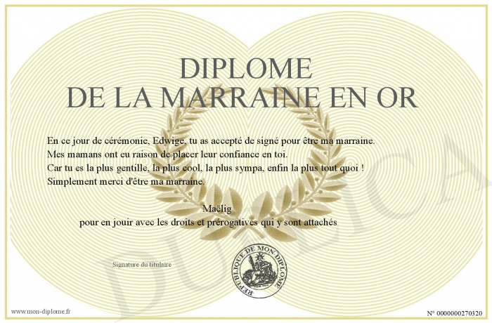Envoyez par email votre Diplôme de la marraine en or personalisé